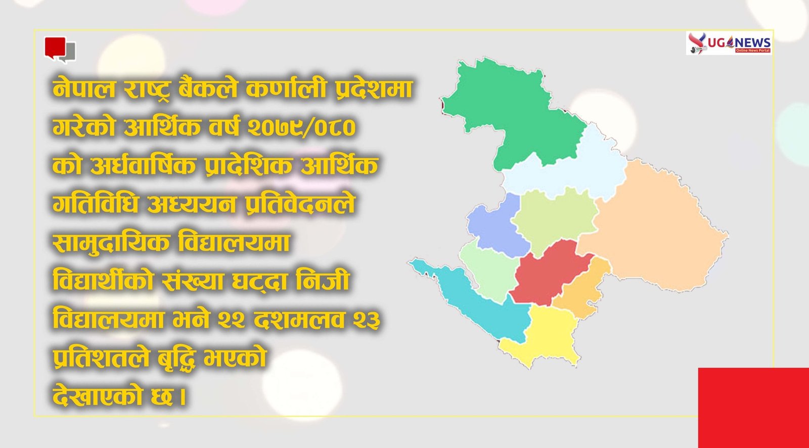 नेपाल राष्ट्र बैंकले कर्णाली प्रदेशमा गरेको आर्थिक वर्ष २०७९/०८० को अर्धवार्षिक प्रादेशिक आर्थिक गतिविधि अध्ययन प्रतिवेदनले सामुदायिक विद्यालयमा विद्यार्थीको संख्या घट्दा निजी विद्यालयमा भने २२ दशमलव २३ प्रतिशतले बृद्धि भएको देखाएको छ ।