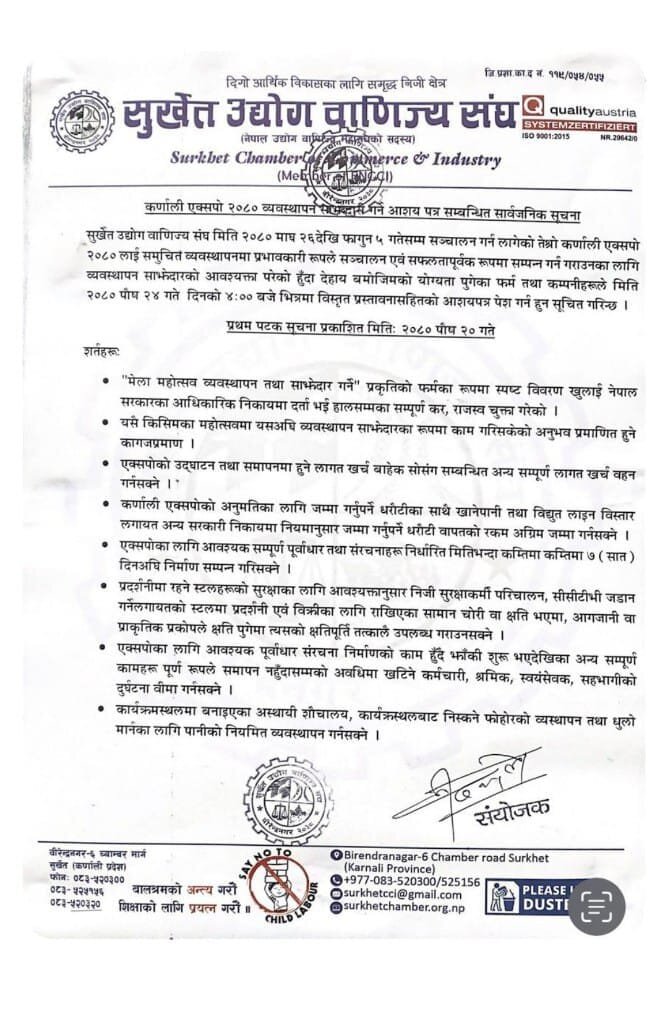 सुर्खेत उद्योग वाणिज्य संघले माघ २६ गतेदेखि फागुन ५ गतेसम्म वीरेन्द्रनगरमा ‘तेस्रो कर्णाली एक्स्पो, २०८०’ सञ्चालन गर्न खोजेको छ । कार्यविधिको परिच्छेद २ (१) मा प्रत्येक आर्थिक वर्षमा वीरेन्द्रनगरभित्र मेला महोत्सव लगाउन चाहने संस्था वा कार्यालयले भदौ मसान्तभित्र आवेदन पेस गर्नुपर्ने भनिएको छ । तर सुर्खेत उद्योग वाणिज्य संघले सो समयभित्र नगरपालिकामा आवेदन दिएको छैन । यो आवेदन कर्णाली प्रदेश उद्योग वाणिज्य महासंघले दिएको छ ।