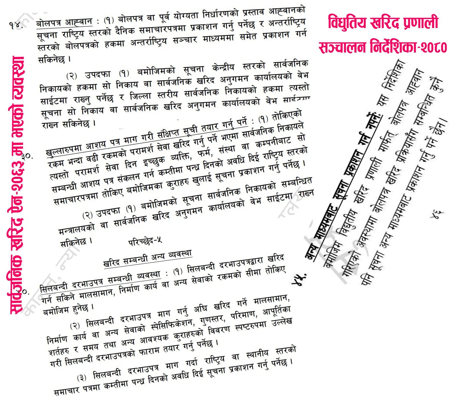 सार्वजनिक खरिद अनुगमन कार्यालयले ‘विद्युतीय खरिद प्रणाली निर्देशिका–२०८०’ जारी गरी विद्युतीय खरिद प्रणालीमार्फत बोलपत्र आह्वान गरिएको अवस्थामा बोलपत्र खरिद प्रक्रियासँग सम्बन्धित कुनै पनि सूचना अन्य माध्यमबाट प्रकाशन गर्नुपर्ने छैन भन्ने व्यवस्था गरेको थियो ।
