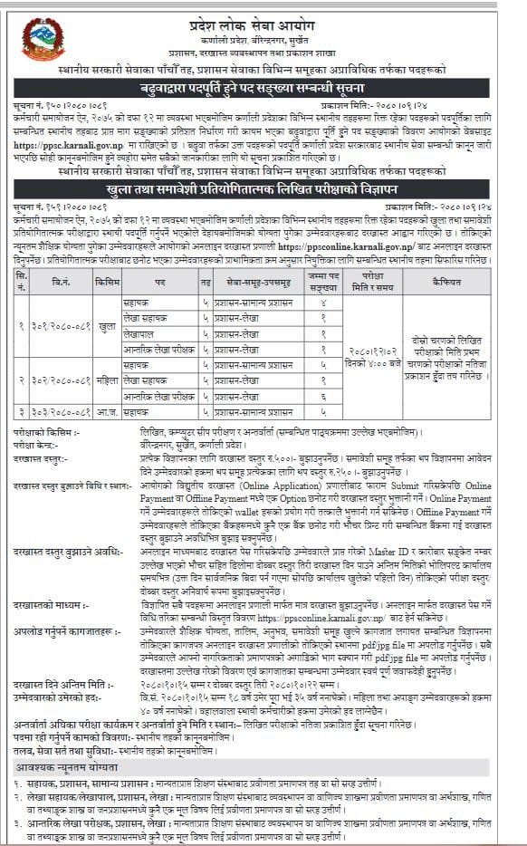 प्रदेश लोक सेवा आयोग कर्णालीले प्रशासन, लेखा, लेखापरीक्षक र लेखा सहायक पदका लागि लिखित परीक्षाको दरखास्त मागेको छ ।
