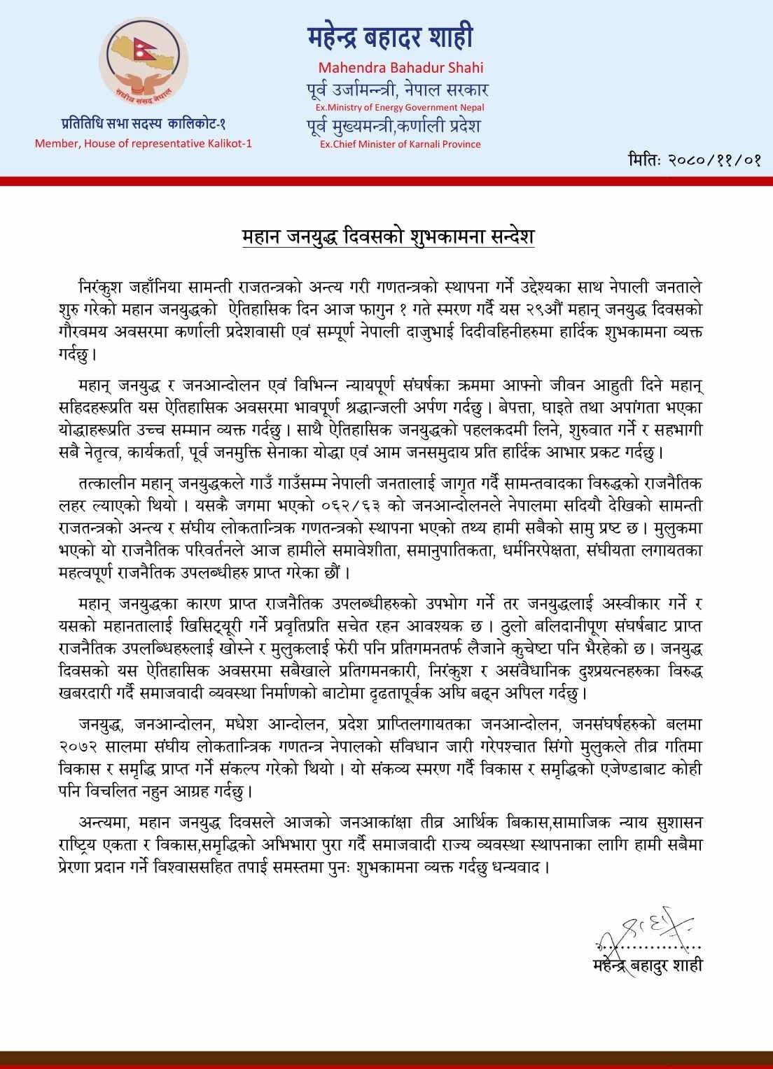नेता शाहीले शुभकामना सन्देशमा लेखेका छन् ‘निरंकुश जहाँनिया सामन्ती राजतन्त्रको अन्त्य गरी गणतन्त्रको स्थापना गर्ने उद्देश्यका साथ नेपाली जनताले शुरु गरेको महान जनयुद्धको ऐतिहासिक दिन फागुन १ गते स्मरण गर्दै यस २९औं महान् जनयुद्ध दिवसको गौरवमय अवसरमा कर्णाली प्रदेशवासी एवं सम्पूर्ण नेपाली दाजुभाई दिदीवहिनीहरुमा हार्दिक शुभकामना व्यक्त गर्दछु ।’