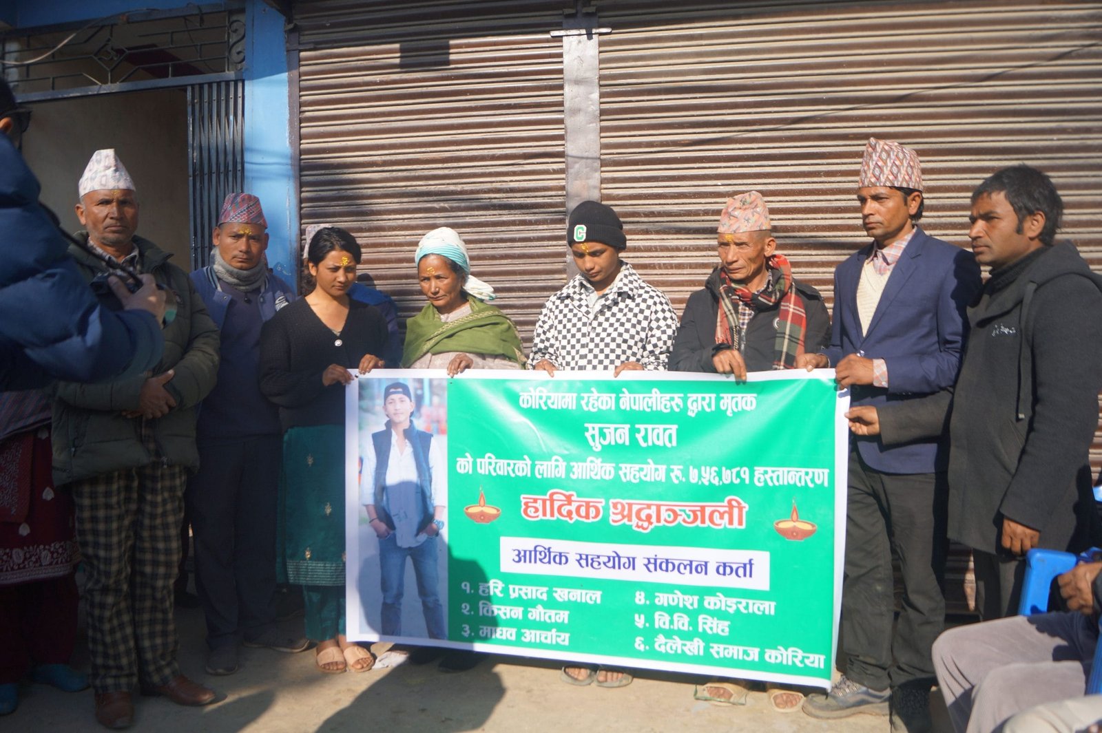 गएको पुस १३ गते ललितपुरको बालकुमारीमा प्रहरीको गोलीबाट मारिएका दैलेख महाबु गाउँपालिका–६ का सुजन रावत र अछामका विरेन्द्र शाहका आफन्तलाई राहत हस्तान्तरण गरिएको छ । कोरियामा रहेका नेपालीले शाह र रावतका परिवारलाई सात लाख ५६ हजार सात सय ८१ रकम हस्तान्तरण गरेका हुन् । विहिवार अछामका शाहलाई सोही रकम हस्तान्तरण गरिएको थियो । शुक्रवार विहाना ९ बजे दैलेख काँडाचौर स्थित रावतको आफन्तलाई सो रकम हस्तान्तरण गरिएको हो ।