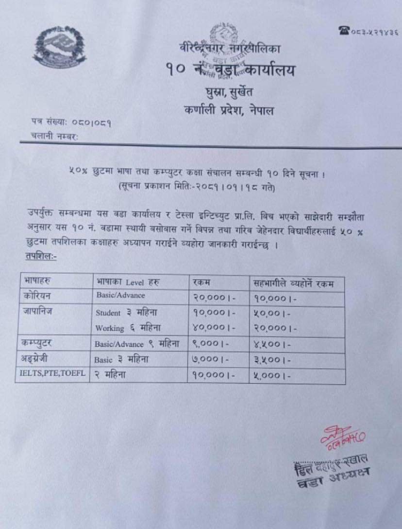 वीरेन्द्रनगर नगरपालिकाको वडा नम्बर १०, १३ र १६ नम्बर वडाले जापनिज, कोरियन, कम्प्यूटर, अंग्रेजी, आइएलटिएस, पीटीई र टोफेल भाषा अध्ययन गर्ने भन्दै १० दिने सार्वजनिक सूचना जारी गरेका छन् ।