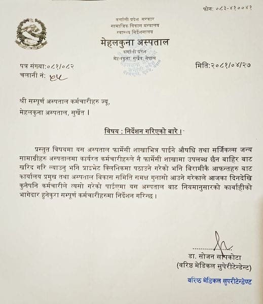 अस्पताल फार्मेसीमा उपलब्ध भएको औषधि पनि प्राईभेट क्लिनिकबाट बिरामीका आफन्तले किनेर ल्याएको गुनासो मेसु तथा अस्पताल विकास समितिका अध्यक्षसँग आएकाले अब त्यसो भए कारबाही गरिने पत्र जारी भएको छ ।