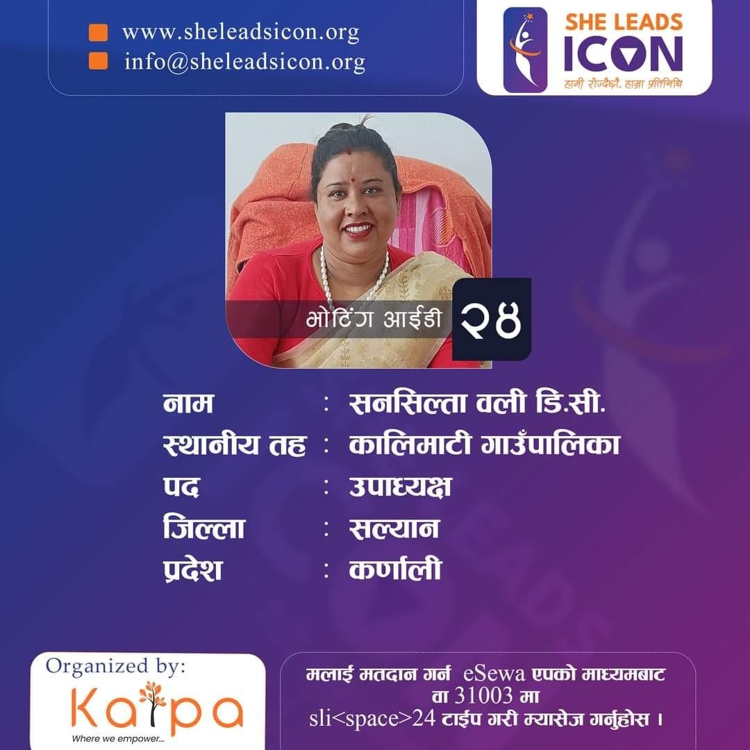 महिला जनप्रतिनिधिहरूको प्रेरणादायी कर्मलाई विश्व सामु पुर्याउने उदेश्यसहित सञ्चालित ‘शी लिड्स आईकन २०८१’ को उत्कृष्ट २७ जनाको लिस्टमा परेकी सल्यान कालिमाटी गाउँपालिका उपाध्यक्ष सनसिल्ता वली डिसीले भोटको अपिल गरेकी छिन् । महिला सशक्तीकरणको क्षेत्रमा काम गर्ने “कल्प इम्पावर वेमेन नेपाल” ले सञ्चालन गरेको यस कार्यक्रममा आफुलाई अगाडी बढाउनका लागि उपाध्यक्ष वली डिसीले आफुले गरिरहेको कामको मुल्यांकन समेत प्रतिविम्बित हुनेगरी मतदान गर्न आह्वान गरेकी हुन् ।