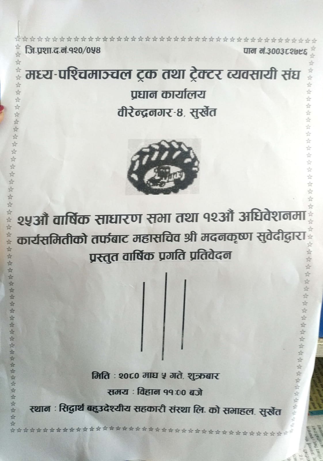 मध्य पश्चिममाञ्चल ट्रक तथा ट्रेक्टर व्यवसायी संघ, सुर्खेतको २५ औं वार्षिक साधारण सभा तथा १२ आंै अधिवेशन सम्पन्न भएको छ । संघका अध्यक्ष चेतनकुमार थानीको सभापतित्व तथा कर्णाली प्रदेश भौतिक पूर्वाधार तथा सहरी विकास मन्त्री मंगलबहादुर शाहीको प्रमुख अतिथ्यतामा उक्त साधारण सभा सम्पन्न भएको हो ।