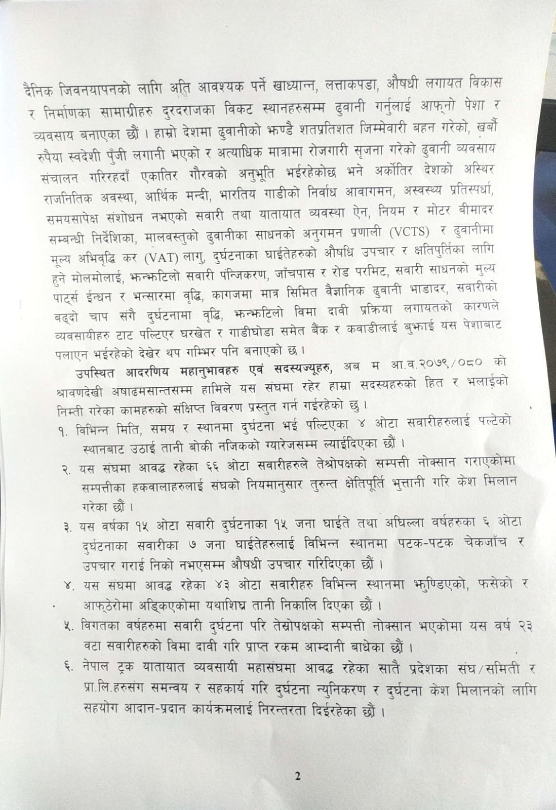 यस्तै यहि पौष २० गतेसम्मको अभिलेख अनुसार आर्थिक वर्ष २०८०÷०८१ को लागि यस संघमा आवद्ध रहेका ट्रक÷मिनिट्रक–१०१, ट्रिप्पर–६३, टे«क्टर–३४, अन्य–१८(टेलर–१, बोलेरो–९, कार–१, जेसिबी–१, दोस्त पिकअप–२, स्कारपियो–२, हेभि रेडीमिक्चर–२) सहित जम्मा दुई सय १६ वटा सवारीहरुको सदस्यता नविकरण भएको छ ।