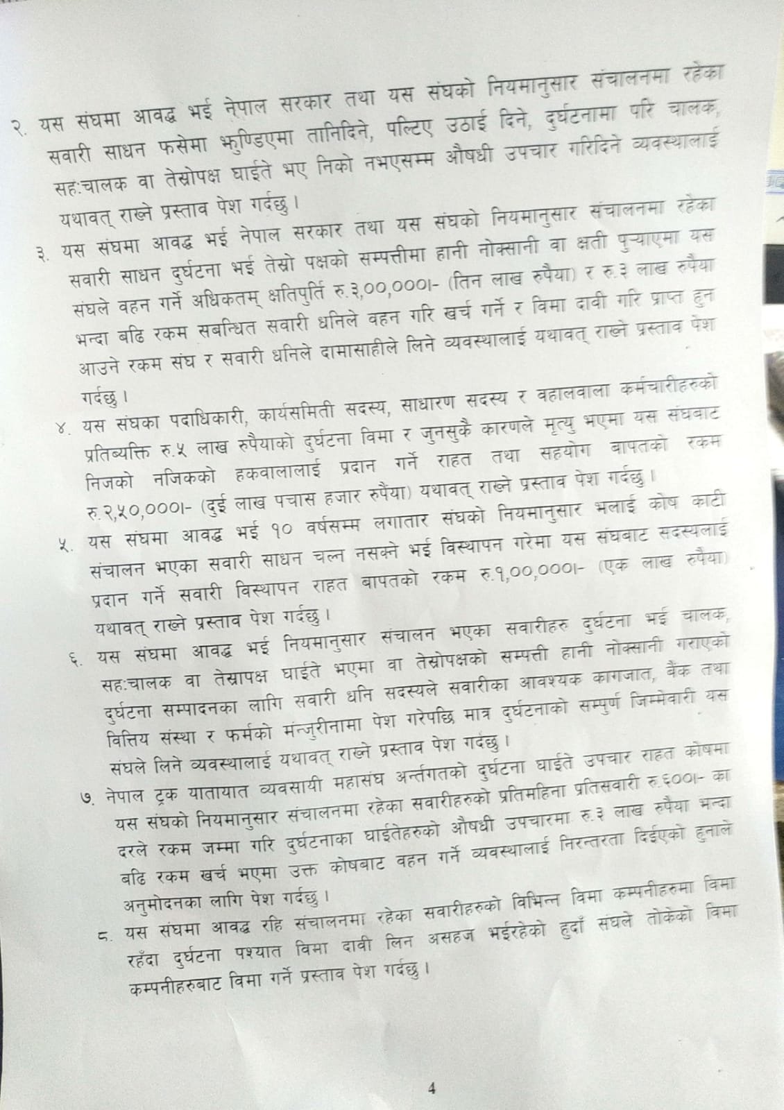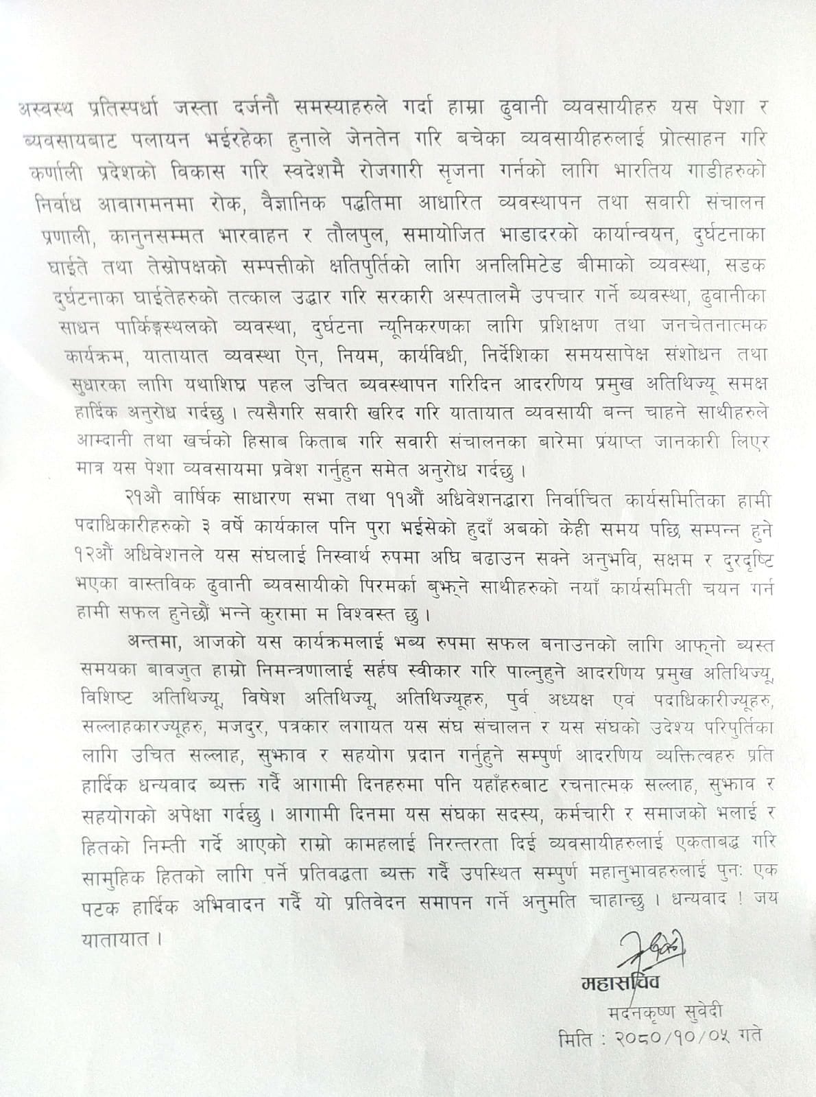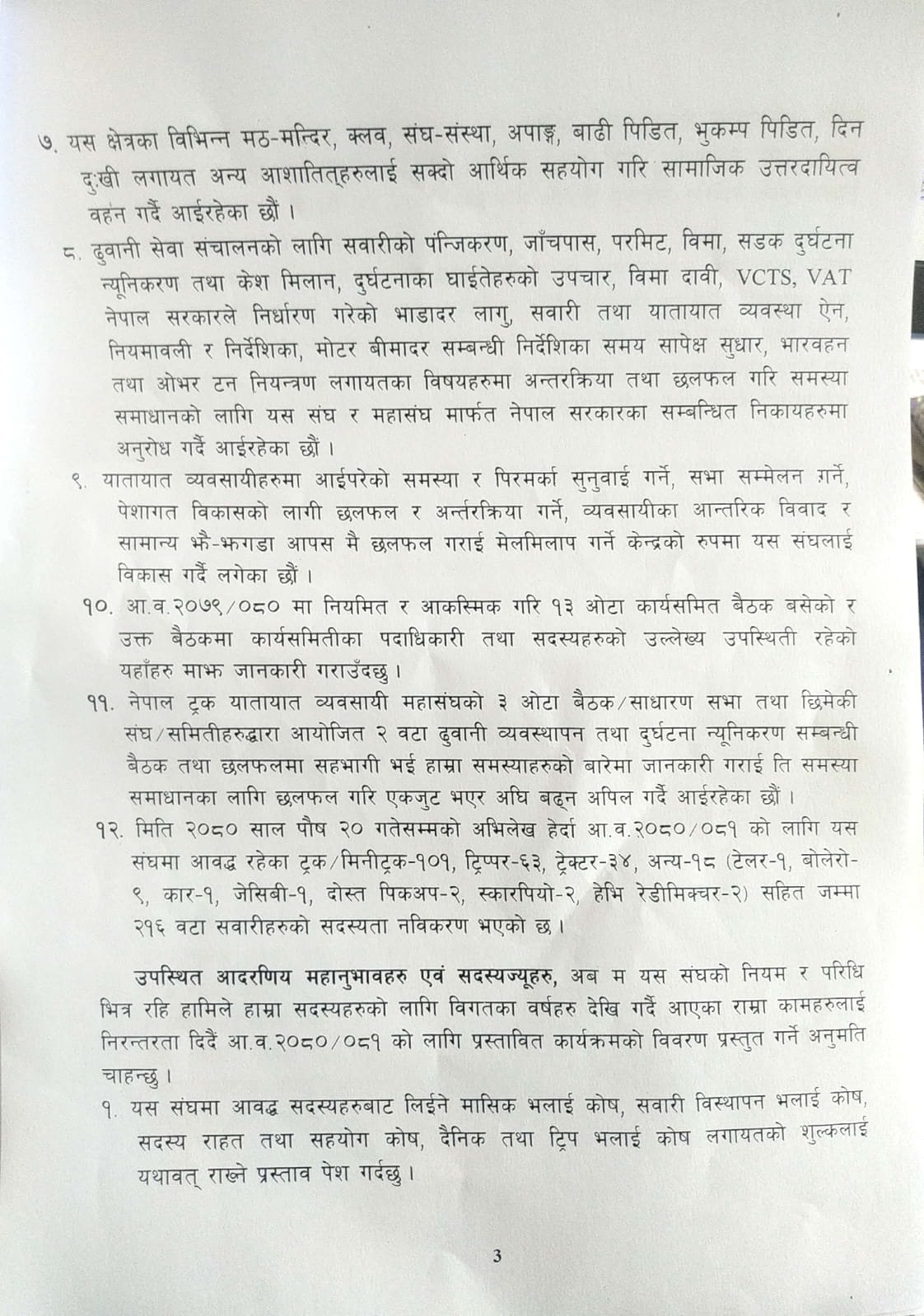 साथै संघको कार्यालय तथा चेक पोइन्टहरु प्यवस्थापन गरि चुस्त दुरुस्त राखि यस संघबाट प्रवाह हुने सेवाहरु छिटो र छरितो उपलब्ध गराउनको लागि आवश्यक कर्मचारीहरुको व्यवस्थापन गरि तालिम तथा प्रशिक्षणको व्यवस्था मिलाईने, भाडाका सवारीहरुको पंन्जिकरण, जाँचपास र रुट परमिट प्रर्णाली बढि झन्झटिलो भएको हुदाँ एकद्धार कर प्रर्णालीमा ल्याउनको लागि आवश्यक व्यवस्था मिलाउन महासंघ मार्फत आवश्यक पहल गर्ने जस्ता कामहरु आगामि दिनहरुमा गर्ने वार्षि प्रगति प्रतिवेदनमा महासचिव सुवेदिले बताएका हुन् ।