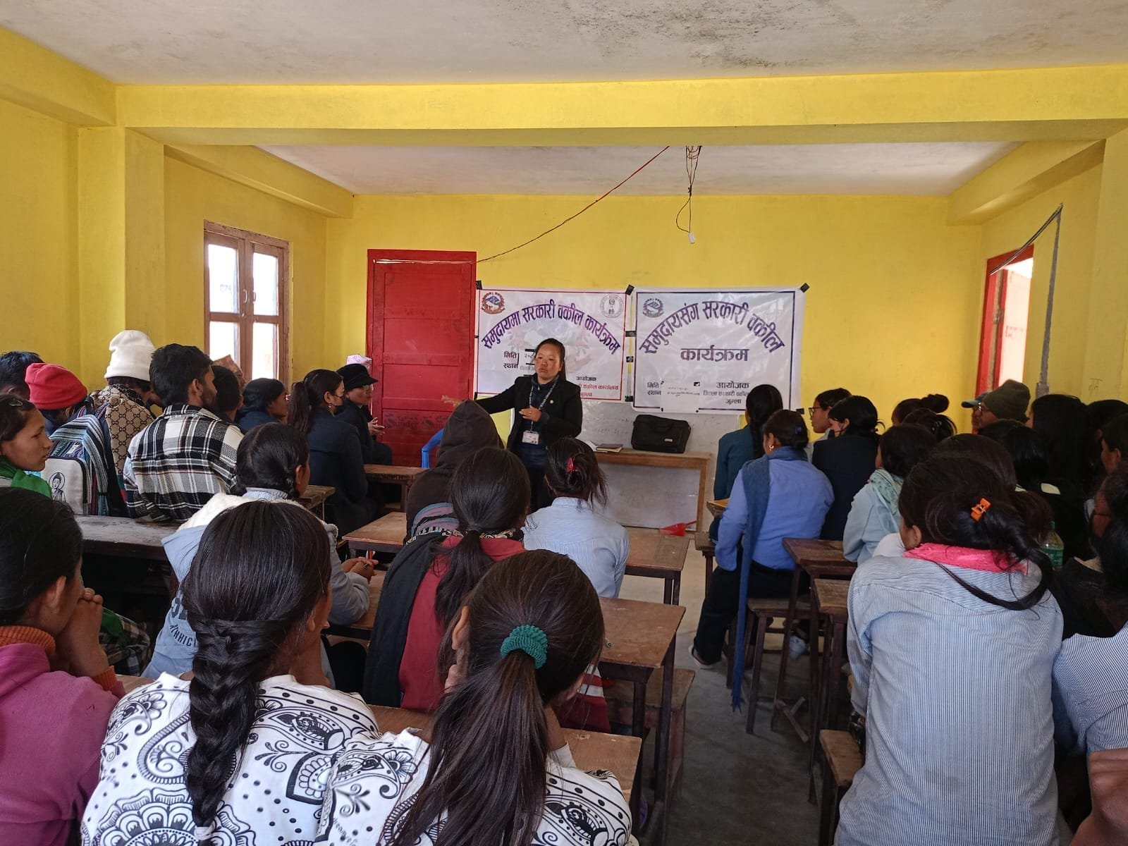 उच्च सरकारी वकिल कार्यालय जुम्लाका निमित्त सहायक न्यायाधिवक्ता दोर्ण पौडेल, जिल्ला सरकारी वकिल कार्यालय जुम्लाका न्यायाधिवक्ता रेनुका राई र राष्ट्रिय मानव अधिकार आयोग जुम्लाका निमित्त प्रमुख धनराज शाही सहितको टोलीले अहिले ग्रामीण क्षेत्रका सामुदायिक विद्यालय पुगेर बालबालिकालाई कानुनका आधारभूत ज्ञान दिइरहेका छन् ।