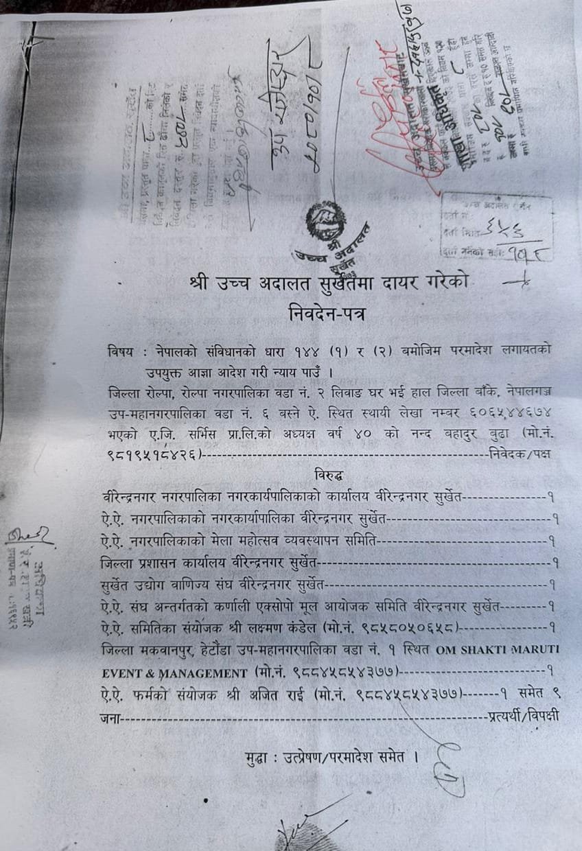 उद्योग वाणीज्य संघ सुर्खेतले २६ माघदेखि ५ फागुनसम्म सञ्चालन गर्न लागेको कर्णाली एक्स्पो–२०८० को ठेक्का विवाद अदालत पुगेको छ । संघले मेला व्यवस्थापनको सेवा खरिद प्रक्रिया मिलेमत्तोमा गरेको दावीसहित एजि सर्भिस प्रालिका अध्यक्ष नन्दबहादुर बुढाले उच्च अदालत सुर्खेतमा उत्प्रेषण/परमादेशको माग गर्दै रिट दायर गरेका हुन् ।