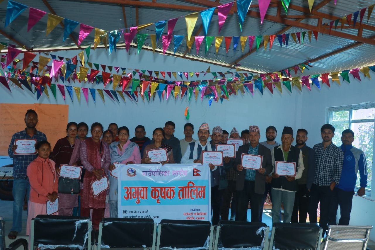 धान, गहुँ, मकै, काउली, आलु लगाएत सुन्तला जातका फलफुलमा लाग्ने रोग किरा व्यवस्थापन र कृषि विमाका बारेमा अगुवा कृषकलाई तालिम प्रदान गरिएको कृषि विकास शाखाले जनाएको छ । तालिम समापन कार्यक्रममा छत्रेश्वरी गाउँपालिकाका सूचना प्रविधि अधिकृत मिलन वली, लेखापाल कमल बडुवाल, नायव प्राविधिक सहायक गणेश भण्डारी लगाएतको पनि सहभागिता रहेको थियो । कार्यक्रमको सहजिकरण पत्रकार शंकर केसीले गरेका थिए ।