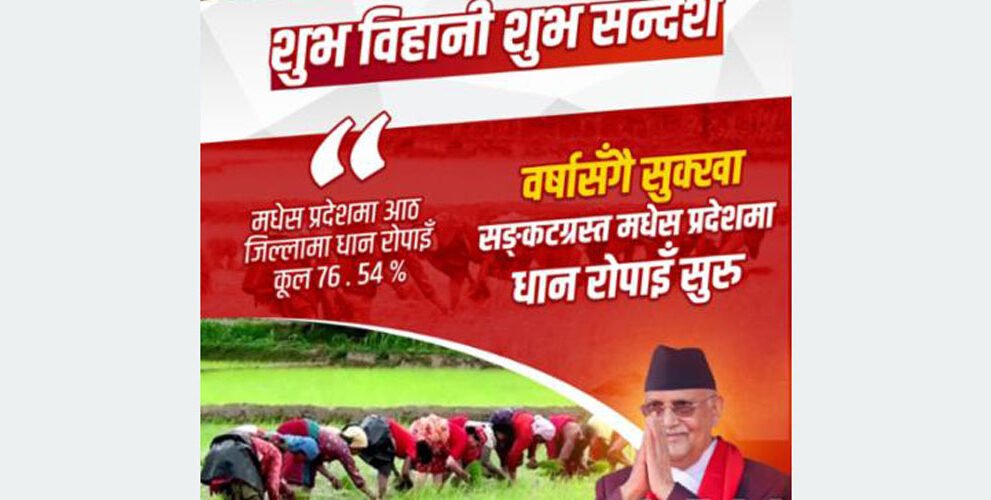 “तत्कालका लागि ५०० वटा डिपबोरिङ जडानको काम सुरु गरिएको थियो, र दीर्घकालीन समाधानका लागि सुनकोशी–मरिन डाइभर्सनको काम अघि बढाइरहेको छ । पछिल्लो साता हामीलाई प्रकृतिले साथ दिएको छ । वर्षाले फेरि हरियाली फर्काउन थालेको छ ।  यही साउन २३ गतेसम्म मधेस प्रदेशका आठ जिल्लामा ७६ दशमलव ५४ प्रतिशत क्षेत्रफलमा धान रोपाइँ भइसकेको छ, र केही दिनमै सम्पूर्ण खेतबारीमा हरियो सपना लहराउनेछ भन्ने आशा छ”, प्रधानमन्त्रीले भनेका छन्