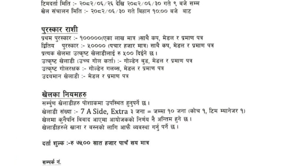 “स्वास्थ्यका लागि खेलकुद, राष्ट्रका लागि खेलकुद” भन्ने नारासहित जुम्लाको हिमामा पहिलोपटक भव्य फुटबल प्रतियोगिता आयोजना हुने भएको छ। हिमा गाउँपालिका–५ स्थित बाजागाडा बालचौर मैदानमा आउदो असोज ३० गतेदेखि कात्तिक ४ गतेसम्म चल्ने प्रथम हिमा गोल्डकप फुटबल प्रतियोगिता को सम्पूर्ण तयारी पूरा भएको आयोजकले जनाएका छन्।प्रतियोगिता हिमा युवा एकता समाजको आयोजनामा र नेपाल अर्गानिक घरको सह–आयोजनामा हुनेछ। युवाहरूमाझ बढ्दो फुटबलको आकर्षणलाई संस्थागत गर्दै स्थानीय प्रतिभालाई प्रोत्साहन गर्न गोल्डकप आयोजना गरिएको आयोजकले बताएका छन्।”असोज ३० गते बिहानसम्म टिम दर्ता गर्न सकिनेछ,” अनाथ युवा क्लबका अध्यक्ष तथा जिल्ला फुटबल संघ जुम्लाका प्रतिनिधि नरजीत शाहीले जानकारी दिए। “टिम दर्ता सकिनासाथ प्रतियोगिता सुरु हुनेछ,” उनले थपे।प्रतियोगिताका विजेता टिमले १ लाख (एक लाख रुपैयाँ) नगद पुरस्कार प्राप्त गर्नेछ भने उपविजेताले ५० हजार (पचास हजार रुपैयाँ) पुरस्कार जित्नेछ।त्यसैगरी प्रत्येक खेलमा उत्कृष्ट प्रदर्शन गर्ने खेलाडीलाई ५ सय, उत्कृष्ट गोलकर्तालाई गोल्डेन बुट, मेडल र प्रमाणपत्र, उत्कृष्ट गोलरक्षकलाई गोल्डेन ग्लब्स, मेडल र प्रमाणपत्र प्रदान गरिनेछ।यसबाहेक, प्रतियोगितामा चम्किएका उदियमान खेलाडीहरूलाई विशेष सम्मान गर्ने व्यवस्था पनि गरिएको आयोजकले जनाएको छ।