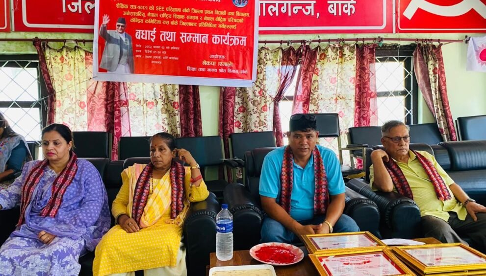 नेपाल कम्युनिस्ट पार्टी (एमाले) अन्तर्गतको शिक्षा तथा माध्यमिक विद्यालय स्रोत विभागले शुक्रबार नेपालगञ्जमा विशेष सम्मान कार्यक्रमको आयोजना गरेको छ। उक्त कार्यक्रममा माध्यमिक शिक्षा परीक्षा (एसईई) २०८१ मा बाँके जिल्लाबाट उच्च उपलब्धि हासिल गर्ने विद्यार्थी, विद्यालय तथा अनेरास्ववियु, नेपाल राष्ट्रिय शिक्षक संगठन र नेपाल बौद्धिक परिषद्का केन्द्रीय तहमा प्रतिनिधित्व गर्ने व्यक्तित्वहरूलाई सम्मान गरिएको हो।