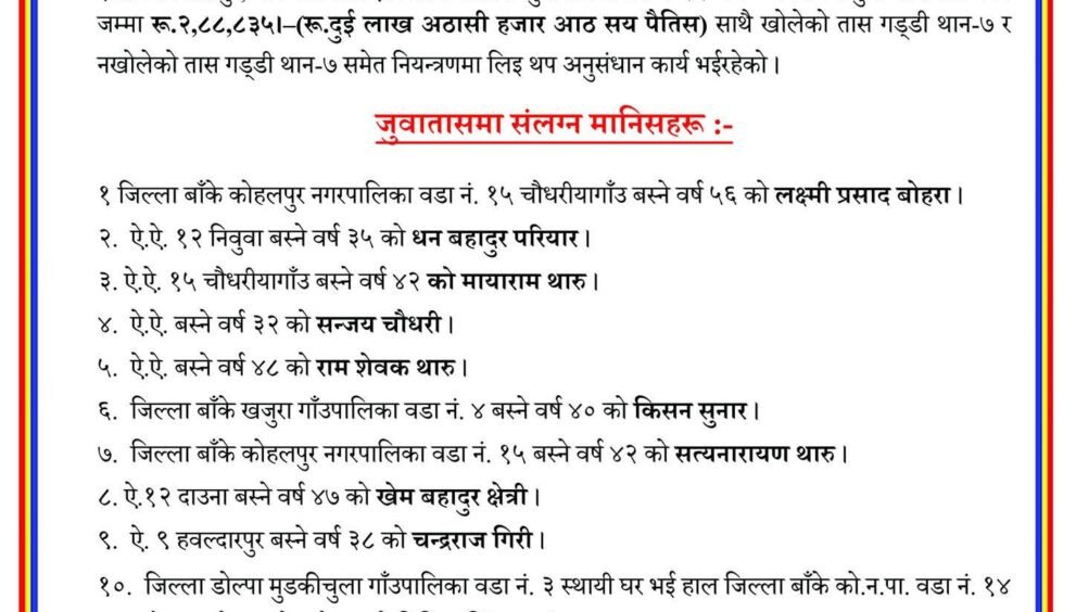 तिहारअघि बाँकेमा कडा प्रहरी अभियान : कोहलपुरबाट तीन लाख रुपैयाँसहित ११ जुवाडे पक्राउ