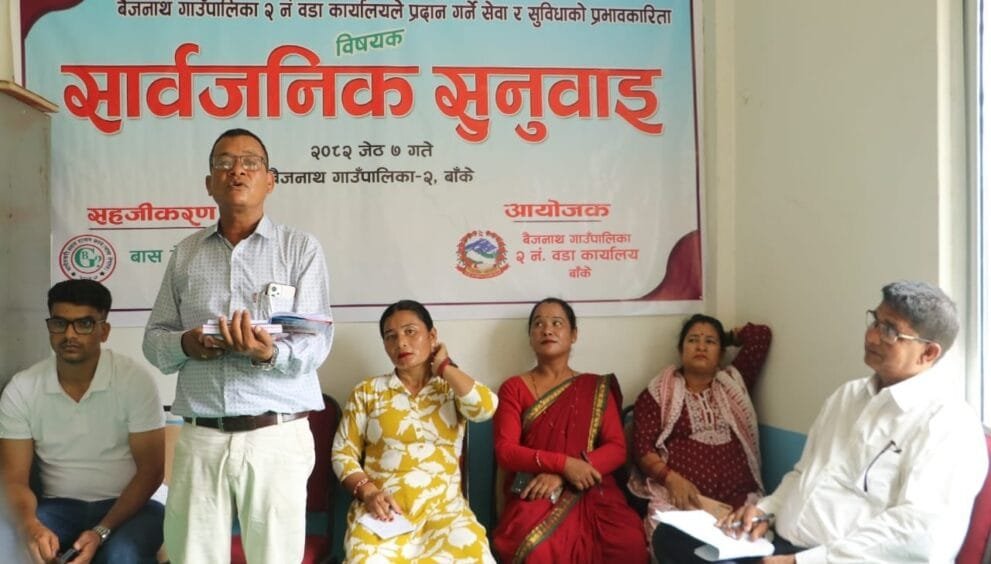 बैजनाथ गाउँपालिका–२ नम्बर वडा कार्यालयले सेवा र सुविधा प्रभावकारितासम्बन्धी सार्वजनिक सुनुवाइ सम्पन्न गरेको छ। बास नेपालको सहजिकरणमा वडा कार्यालय परिसरमा सम्पन्न कार्यक्रममा वडाबासी र सेवा प्रदायक निकायबीच खुला छलफल भएको थियो। छलफलको निष्कर्षमा ६ बुँदे साझा प्रतिबद्धता सार्वजनिक गरिएको हो।
