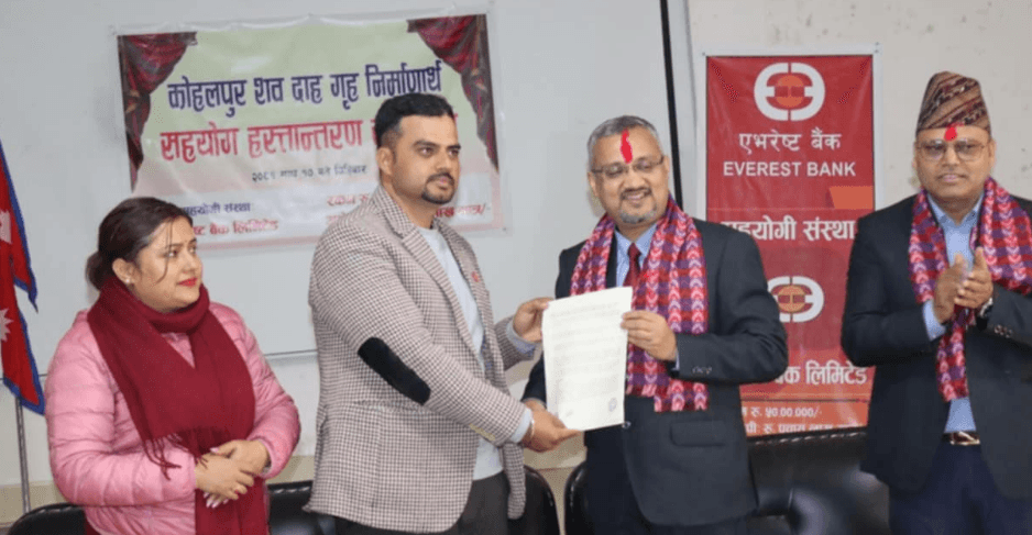 कोहलपुर नगरपालिकामा बिहीबार आयोजित विशेष कार्यक्रममा एभरेष्ट बैंकका लुम्बिनी प्रदेश प्रमुख लव प्रसाद कुइँकेलले ५० लाख रुपैयाँको चेक कोहलपुर शवदाह गृह निर्माण उपभोक्ता समितिका अध्यक्ष चक्र अधिकारीलाई हस्तान्तरण गरे। चेक हस्तान्तरण समारोहमा नगर प्रमुख पूर्ण प्रसाद आचार्य, नगर उपप्रमुख संगिता सुवेदी, र शवदाह गृह निर्माण समितिका संयोजक वीरेन्द्र कुमार शाहको उपस्थिति थियो।