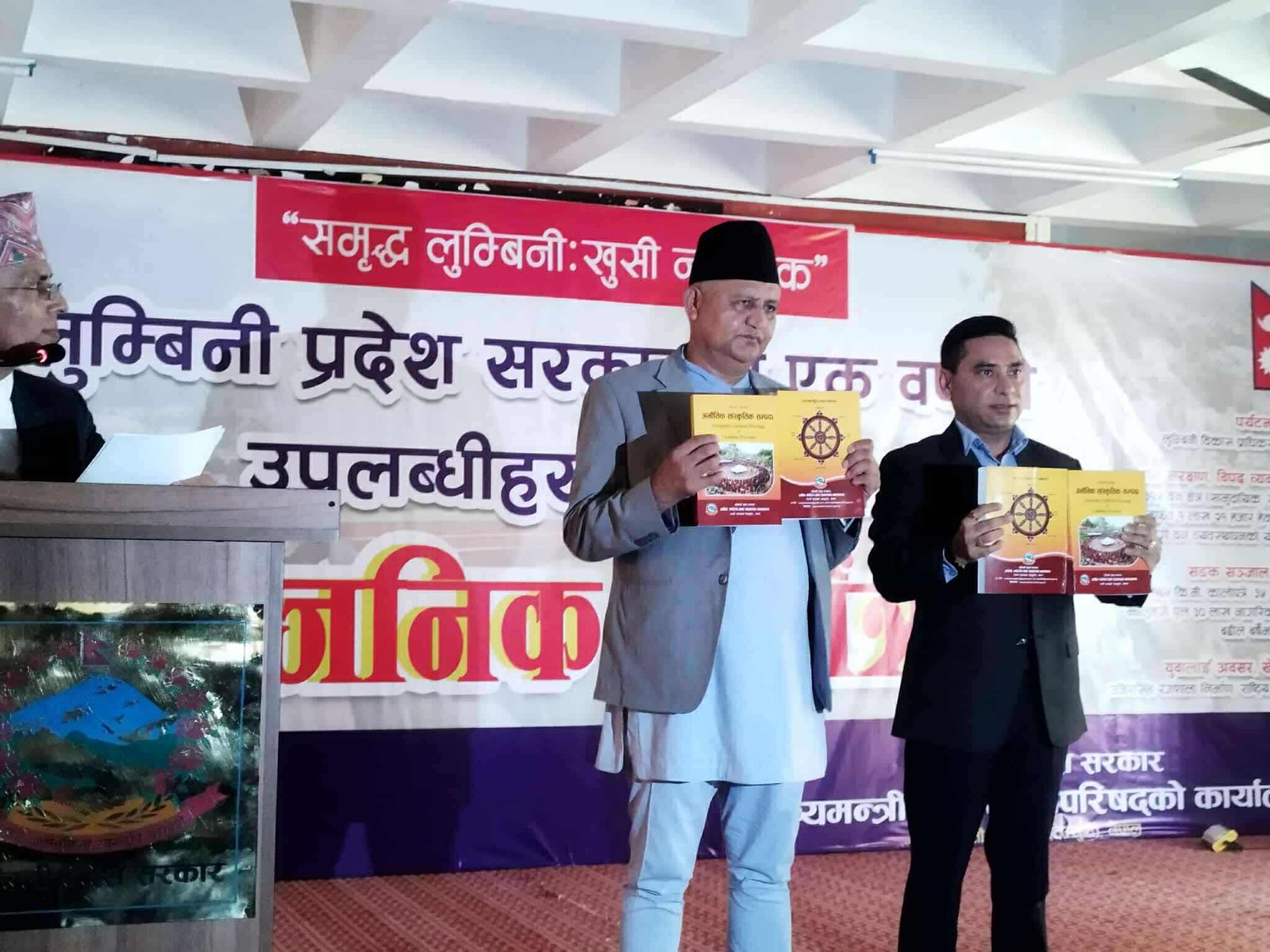 सरकार गठन भएको एक बर्षको अवधिमा प्रदेश सरकारले ७६ बुदे उपलब्धि सार्वजनिक गरेको हो । संघीयताको संस्थागत अभ्यासमा लुम्बिनी प्रदेशले अग्रणी भूमिका खेलेको छ । सरकार जनताका लागि देखिने, भेटिने र सुनिने बनोस् भन्ने उद्देश्यका साथ सञ्चालन गरिएको नीति तथा कार्यक्रमहरूले प्रदेशलाई संघीय अभ्यासको ‘मोडेल’ प्रदेशको रूपमा उभ्याउने प्रयास गरेका छन् । प्रमुख सचिव वावुराम अधिकारीको अध्यक्षता तथा मुख्यमन्त्री चेतनारायण आचार्यको प्रमुख आतिथ्यतामा सम्पन्न कार्यक्रममा मुख्यमन्त्री तथा मन्त्रिपरिषद् कार्यालयका सचिव इश्वरराज पौडेलले एक बर्षे उपलब्धिहरुको विवरण प्रस्तुत गर्नु भएको थियो भने सहरी विकास तथा खानेपानी मन्त्री सरोज थापा(रोज राणा)ले स्वागत मन्तब्य व्यक्त गर्नु भएको थियो । कार्यक्रमको सहजीकरण मुख्यमन्त्री कार्यालयका सचिव कविन्द्र नेपालले गर्नु भएको थियो ।