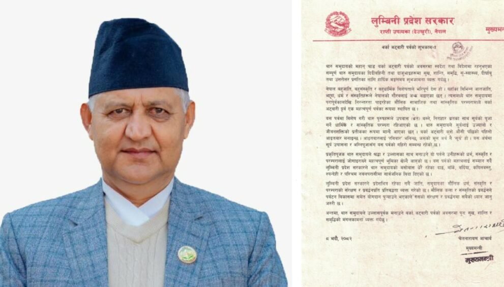 लुम्बिनी प्रदेशका मुख्यमन्त्री चेतनारायण आचार्यले थारु समुदायको महान् चाड बर्का अट्वारी पर्वको अवसरमा शुभकामना व्यक्त गर्नुभएको छ । थारु समुदायले उल्लासपूर्वक मनाउने बर्का अट्वारी पर्वले सबैमा भाईचारा, एकता र समृद्धिको भावना जागृत होस् भन्ने शुभकामना व्यक्त गर्नुभएको हो ।