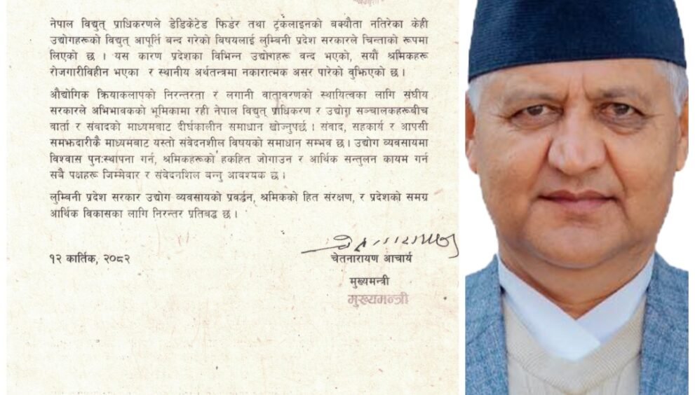 लुम्बिनी प्रदेशका मुख्यमन्त्री चेतनारायण आचार्यले डेडिकेटेड फिडर र ट्रंकलाइनको बक्यौता नतिरेका उद्योगहरूको विद्युत् आपूर्ति बन्द भएको विषयमा वार्ता र संवादको माध्यमबाट समाधान खोज्न आग्रह गर्नुभएको छ ।