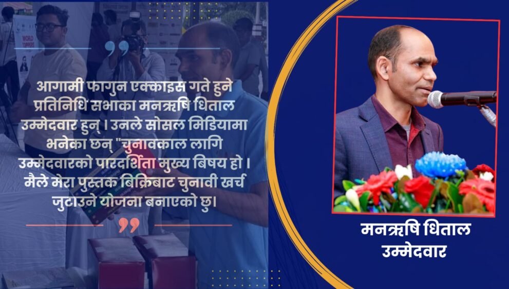 आगामी फागुन २१ गते हुने प्रतिनिधिसभा सदस्य निर्वाचनमा प्रगतिशील लाेकतान्त्रीक पार्टी बाट उम्मेदवार बनेका मनऋषि धितालले चुनावी खर्च जुटाउन किताब लाई माध्यम बनाएका छन् ।