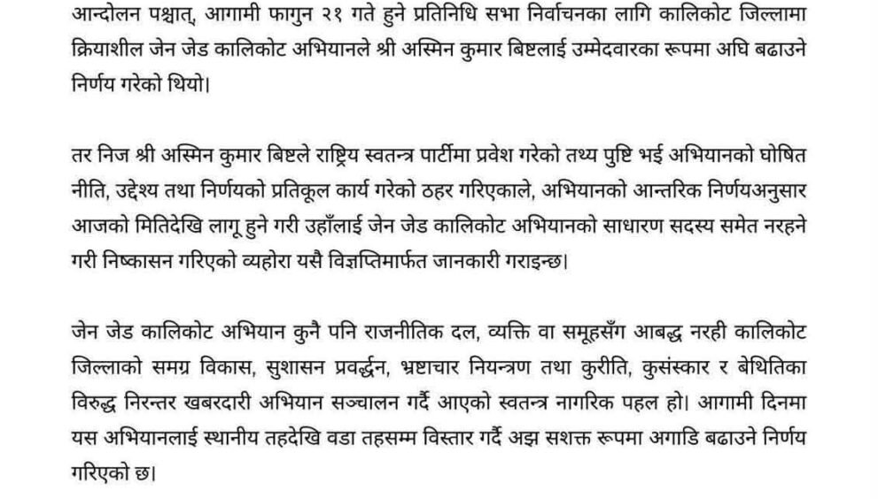 अभियानले जारी गरेको विज्ञप्तिअनुसार २०८२ भदौ २३ र २४ गते सम्पन्न युवापुस्ताको संयुक्त आन्दोलनपश्चात आगामी फागुन २१ गते हुने प्रतिनिधि सभा निर्वाचनका लागि कालिकोट जिल्लामा जेन जेड कालिकोट अभियानमार्फत अस्मिन कुमार बिष्टलाई उम्मेदवारको रूपमा अघि बढाउने निर्णय गरिएको थियो।