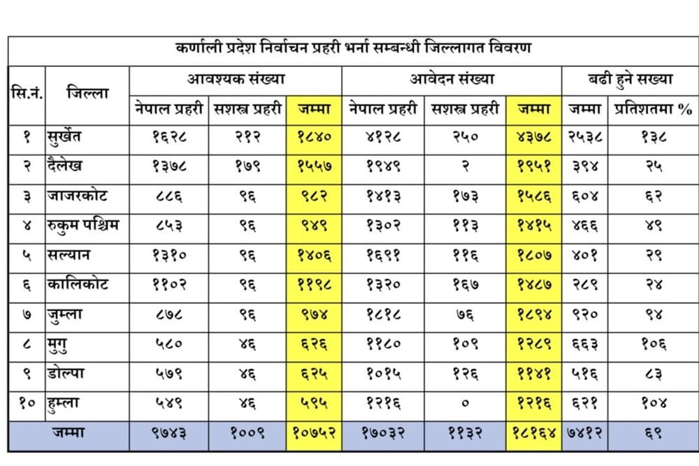 जाडो बिदा र व्यापारका सिलसिलामा केही युवा कालापहाड झरेका कारण संख्या अपेक्षाभन्दा घटेको उनले बताए।आवेदकहरू अधिकांश २५ देखि ३५ वर्ष उमेर समूहका छन्। कोटा भन्दा कम आवेदन परेका जिल्लामा दुई दिन म्याद थपिए पनि जुम्लाका लागि म्याद थप आवश्यक नरहेको रेग्मीले बताए। उनका अनुसार माघ ५ गतेदेखि छनोट प्रक्रिया सुरु हुनेछ। लिखित र मौखिक परीक्षा गरी माघ ९ गतेसम्म छनोट सक्ने तालिका बनाइएको छ।निर्वाचन प्रहरीमा यसअघि निर्वाचनमा काम गरेका म्याद प्रहरीदेखि भूतपूर्व प्रहरीसम्मले आवेदन दिएका छन्। कर्णाली प्रदेशका १० जिल्लामा निर्वाचन प्रहरीका लागि कुल १८ हजार १ सय ६४ जनाले आवेदन दिएका छन्। यसमध्ये नेपाल प्रहरीका १७ हजार ३२ र सशस्त्र प्रहरी बलका १ हजार १ सय ३२ जना छन्।प्रदेशभर निर्वाचन प्रहरीको कोटा १० हजार ७ सय ५२ रहेको छ। जसमा नेपाल प्रहरी ९ हजार ७ सय ७३ र सशस्त्र प्रहरी बल १ हजार ९ जना छन्। आवेदन खुलाइएको ७ दिनमै कोटाभन्दा दोब्बरभन्दा बढी आवेदन परेको हो।अन्य जिल्लाको तुलनामा सुर्खेतमा कोटाभन्दा दोब्बर बढी आवेदन परेको छ।