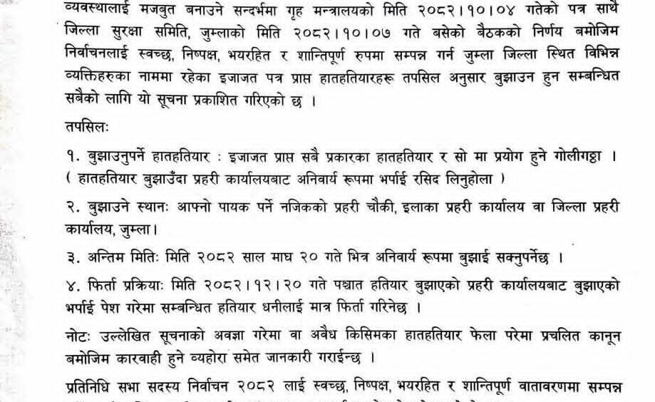 आगामी फागुन २१ गते हुने प्रतिनिधिसभा सदस्य निर्वाचनलाई लक्षित गर्दै जुम्ला प्रशासनले इजाजतपत्र प्राप्त हातहतियार संकलन प्रक्रिया सुरु गरेको छ । निर्वाचनको संवेदनशीलतालाई मध्यनजर गर्दै प्रशासनले यो कदमलाई पूर्वतयारी सुरक्षात्मक रणनीतिको हिस्साका रूपमा अघि सारेको हो ।गृह मन्त्रालयको माघ ४ गतेको निर्देशन र जिल्ला सुरक्षा समिति, जुम्लाको माघ ७ गतेको बैठक निर्णयअनुसार जिल्लाभित्र दर्ता भएका सबै प्रकारका हातहतियार तथा गोलीगठ्ठा माघ २० गतेभित्र अनिवार्य रूपमा प्रहरीलाई बुझाउनुपर्ने व्यवस्था गरिएको प्रमुख जिल्ला अधिकारी दिपक पौड्यालले बताए ।उनका अनुसार, “निर्वाचनको समयमा सानो घटनाले पनि ठूलो परिणाम निम्त्याउन सक्छ । त्यसैले सम्भावित जोखिम न्यूनीकरण गर्न हातहतियार संकलन आवश्यक छ ।