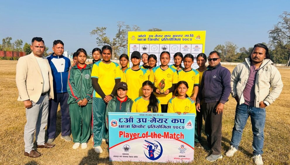 कोहलपुरमा जारी आठौँ उपमेयर छात्रा कप अन्तरमाध्यमिक विद्यालय क्रिकेट प्रतियोगिता–२०८२ को चौथो दिन दुई खेल भएका छन् । कोहलपुर नगर खेलकुद विकास समितिको सञ्चालन र व्यवस्थापनमा सञ्चालन भइरहेको प्रतियोगिताको चौथो दिन दुई खेल भएका हुन् । कोहलपुर क्रिकेट मैदानमा पहिलो खेल ज्ञान ज्योति मावि र सगरमाथा स्कुलबीच भएको थियो । टस जितेर पहिला ब्याटिङ गरेको सगरमाथाले १३.४ ओभरमा अलआउट हुँदै ५७ रन बनाएको थियो । ५८ रनको सामान्य लक्ष्य पाएको ज्ञान ज्योतिले ८.४ ओभरमै अलआउट हुँदै जम्मा ४१ रन मात्रै बनाउन सक्यो । उक्त खेलमा सगरमाथा १६ रनले विजयी भएको खेल संयोजक मदन विकले बताए । खेलमा म्यान अफ द म्याच सगरमाथाकी करिष्मा शाही भइन् । उनलाई समाजसेवी चिन्तामणी धितालले पुरस्कार वितरण गरेका थिए ।