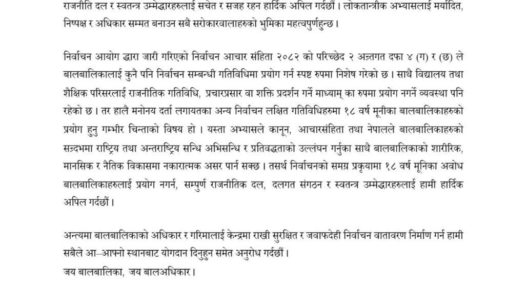 आसन्न राष्ट्रिय सभा तथा प्रतिनिधि सभा निर्वाचनको समग्र प्रक्रिया सुरु भएसँगै निर्वाचन गतिविधिमा बालबालिकाको प्रयोग हुनसक्ने जोखिमप्रति बालअधिकारको क्षेत्रमा क्रियाशील नागरिक समाज संस्थाहरूको सञ्जाल सिसिआर कर्णालीले गम्भीर ध्यानाकर्षण गराउँदै सम्पूर्ण राजनीतिक दल, दलगत संगठन तथा स्वतन्त्र उम्मेदवारलाई सचेत र संयमित रहन हार्दिक अपिल गरेको छ।