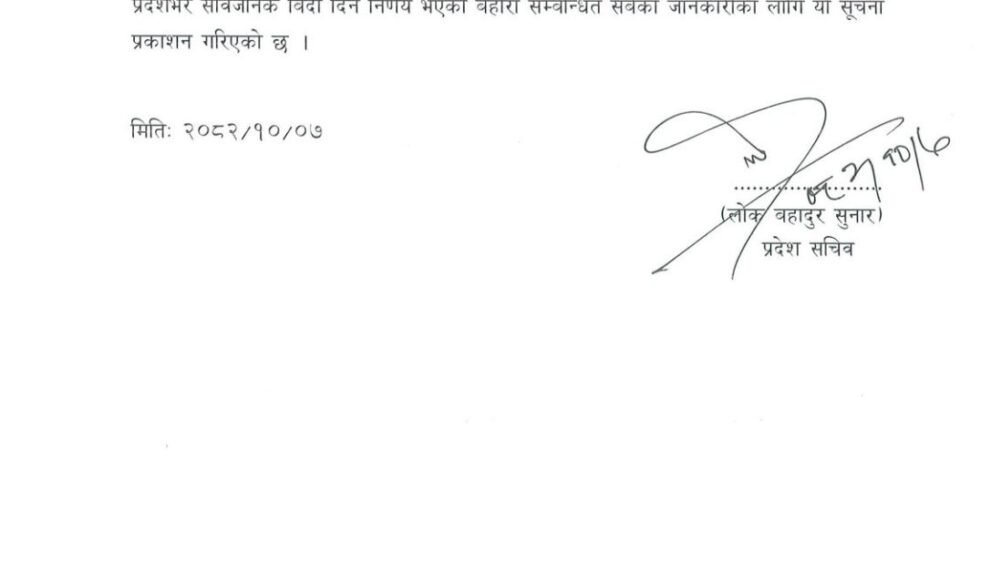 प्रदेश सरकारद्वारा २०८१ चैत २१ गते प्रदेश राजपत्रमा प्रकाशित सार्वजनिक सूचनाअनुसार वसन्तपञ्चमीको दिन सार्वजनिक बिदा दिने निर्णय गरिएको थियो। सोही निर्णय बमोजिम आज प्रदेशभर बिदा कार्यान्वयन गरिएको मन्त्रालयले जनाएको छ।