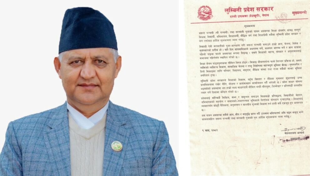 लुम्बिनी प्रदेशका मुख्यमन्त्री चेतनारायण आचार्यले शिक्षालाई पाठ्यपुस्तकमा सीमित नराखी जीवन, व्यवहार र मूल्यसँग जोड्न आवश्यक रहेको बताउनुभएको छ । वसन्तपञ्चमी तथा सरस्वती पूजाको अवसरमा शुक्रबार एक शुभकामना सन्देश जारी गर्दै उहाँले गुणस्तरीय शिक्षामार्फत मात्र सीपयुक्त, जिम्मेवार र प्रतिस्पर्धी जनशक्ति तयार गर्न सकिने बताउनुभएको हो ।