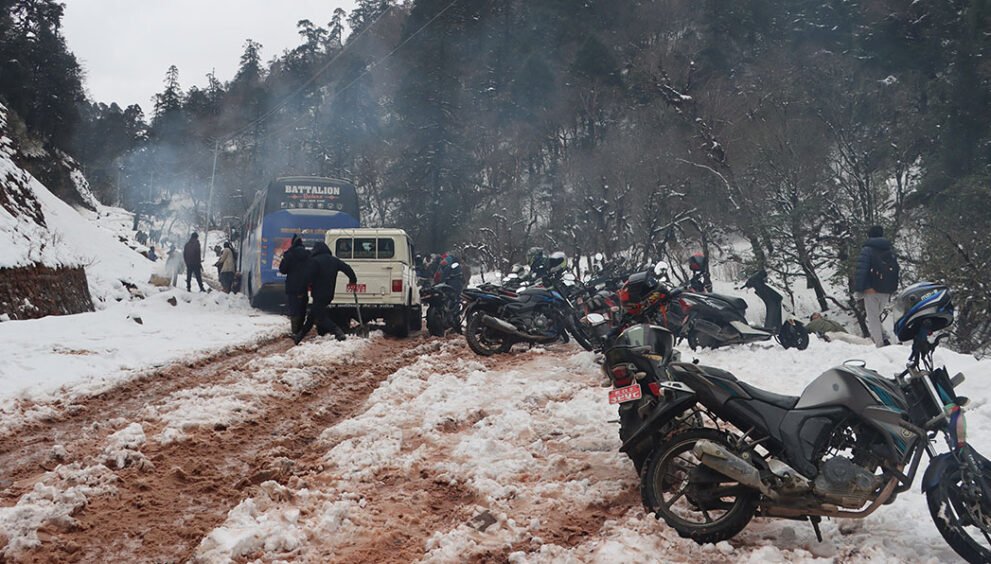 हिमपातले मध्यपहाडी लोकमार्ग अवरुद्ध, फसेका गाडी र यात्रुको उद्धार हुँदै