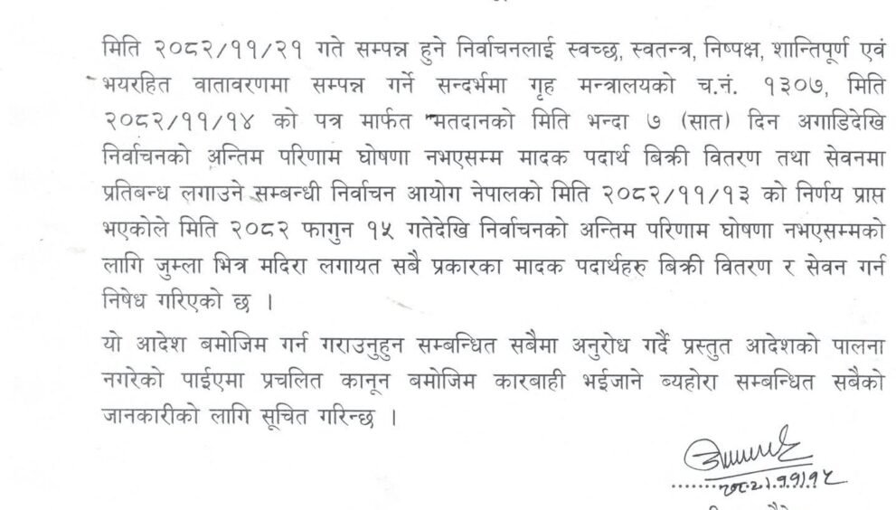 आगामी फागुन २१ गते प्रतिनिधि सभा सदस्य निर्वाचनको तयारीको क्रममा जिल्लामा मादक पदार्थको बिक्री, वितरण तथा सेवनमा पूर्ण प्रतिबन्ध लगाइएको छ। प्रमुख जिल्ला अधिकारी दीपक पौड्यालले जारी गरेको आदेश अनुसार, फागुन १५ गतेदेखि निर्वाचनको अन्तिम परिणाम घोषणा नभएसम्म मदिरा र अन्य सबै प्रकारका मादक पदार्थमा प्रतिबन्ध लागू हुने भएको छ।यस आदेशको आधार गृह मन्त्रालयको च.नं. १३०७, फागुन १४ को पत्र र निर्वाचन आयोग नेपालको फागुन १३ को निर्णय हो। निर्णयमा भनिएको छ कि मतदानभन्दा ७ दिन अघि नै मादक पदार्थमा प्रतिबन्ध लगाउनुपर्ने आवश्यकताले निर्वाचनलाई स्वच्छ, स्वतन्त्र, निष्पक्ष, शान्तिपूर्ण र भयरहित बनाउने उद्देश्य राखिएको छ।