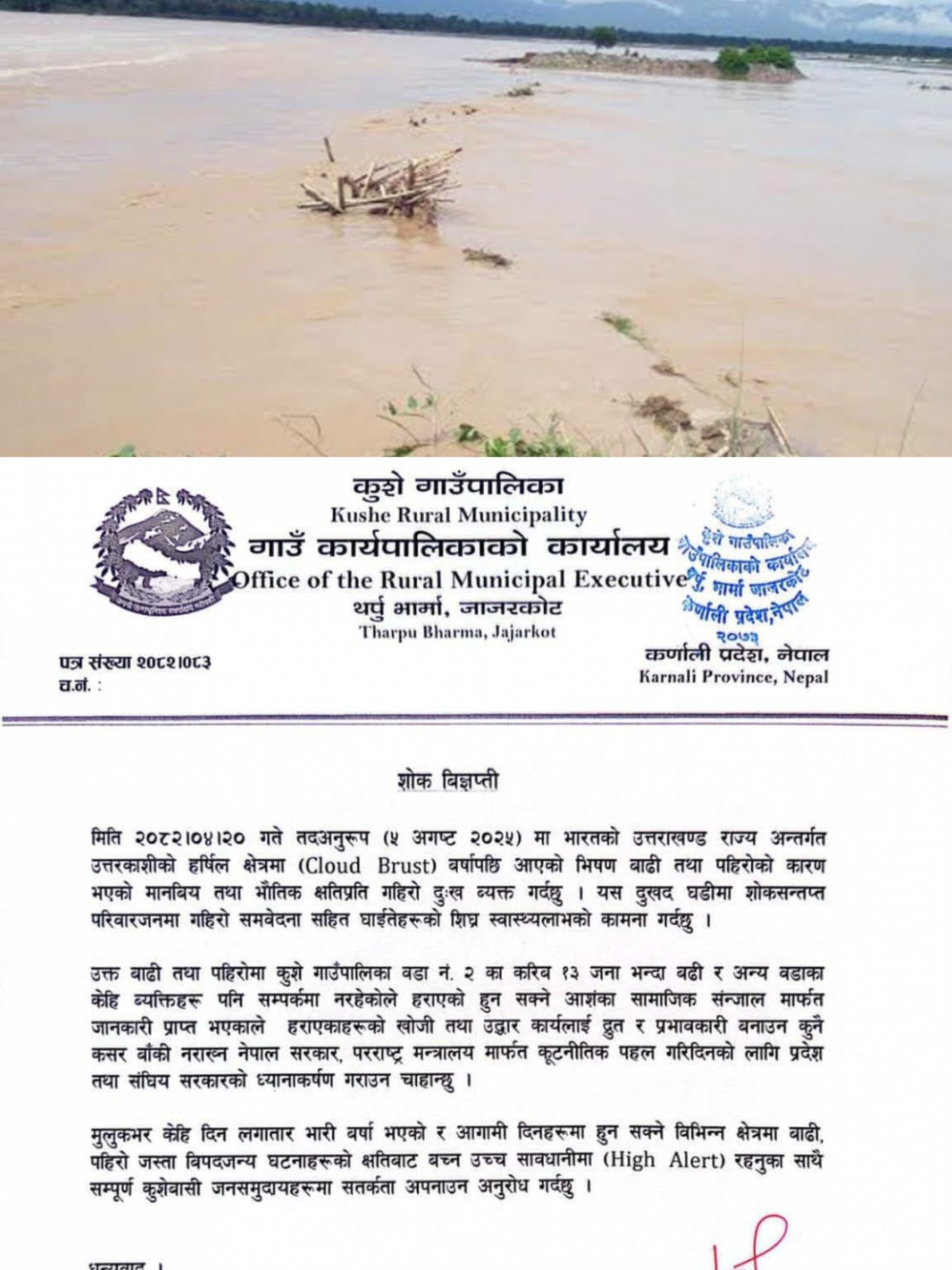 -->भारतको बाढीमा कुशे गाउँपालिकाका १३ नेपाली सम्पर्कबिहिन जाजरकोट ,२३ साउन। भारतको उत्तराखण्ड राज्य अन्तर्गत उत्तरकाशीको हर्षित क्षेत्रमा गएको भीषण वर्षापछिको बादल फाट्ने (क्लाउड बर्स्ट) घटनाका कारण आएको युग संवाददाताComment (0) (179)