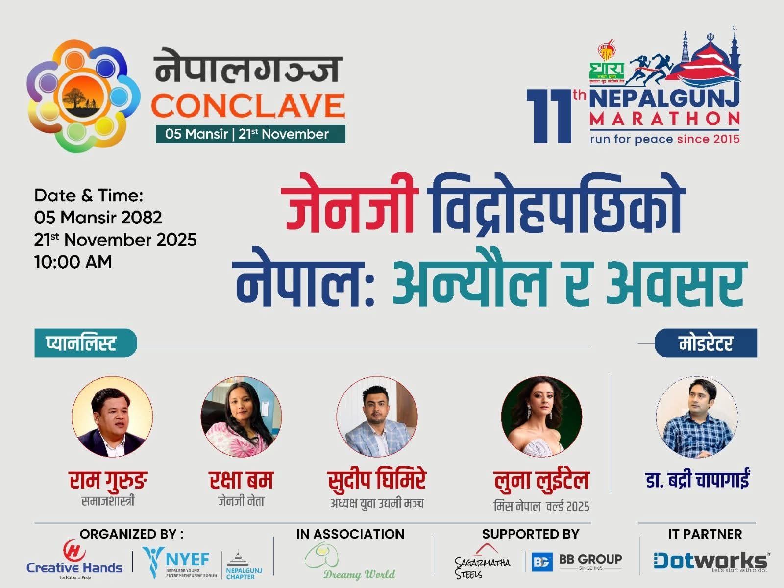 -->नेपालगन्ज कनक्लेभ–२०२५’ तयारी पूरा फाइनप्रिन्ट फिभर मुख्य आकर्षण बाँके, ३ मंसिर । नेपालगन्जमा मंसिर ५ गते आयोजना हुने ‘नेपालगन्ज कनक्लेभ–२०२५’का लागि आवश्यक सबै तयारी पूरा भएको आयोजकले जानकारी सरला सुवेदीComment (0) (101)