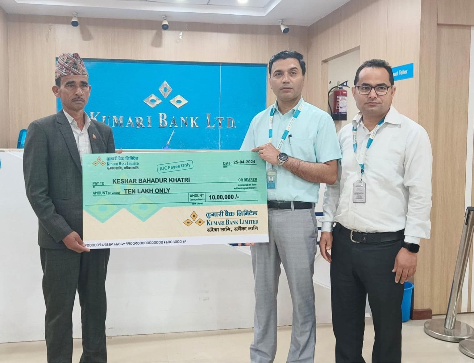 कुमारी बैंक लिमिटेड सुर्खेतले १० लाख रुपैयाँको दुर्घटना बिमा रकम भुक्तानी गरेको छ । परिवार सुरक्षा बचत खाता योजना’अन्तर्गत खाताधारकलाई सो रकम हस्तान्तरण गरिएको बैंकले जनाएको छ । खाताधारकको परिवारको तर्फबाट सिम्ता गाउँँपालीका वडा नं ४ सिमल गाउँ निवासी खातावाला केशर बहादुर खत्रीलाई श्रीमतिको दुर्घटना मृत्युपश्चात उक्त रकम हस्तान्तरण गरेको हो । उक्त रकम कुमारी बैंक लिमिटेडको […]