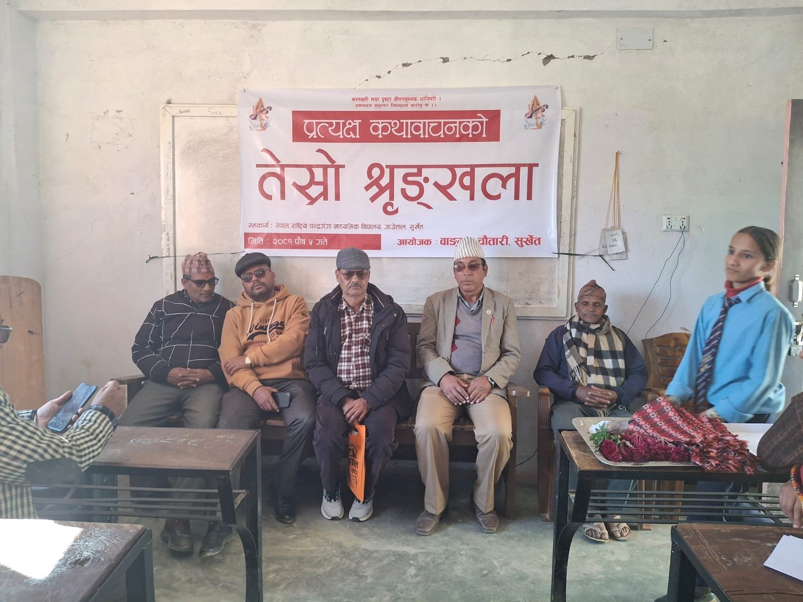 वाङ्मय चौतारी नेपाल, सुर्खेतको आयोजनामा तेस्रो कथा बाचत श्रृङ्खला शुक्रबार सम्पन्न भएको छ । नेपाल राष्ट्रिय चन्द्रगंगा माध्यमिक विद्यालय वीरेन्द्रनगर–११, गाग्रेतालमा कार्यक्रम सम्पन्न भएको हो । वाङ्मय चौतारी नेपाल सुर्खेतका अध्यक्ष गणेशभक्त गौतमको अध्यक्षता र विद्यालय व्यवस्थापन समितिका सदस्य हरिलाल कँडेलको प्रमुख आतिथ्यतामा कथा बाचन सम्पन्न भएको थियो । कार्यक्रममा स्वागत मन्तव्य नवराज खड्काले राखेका […]