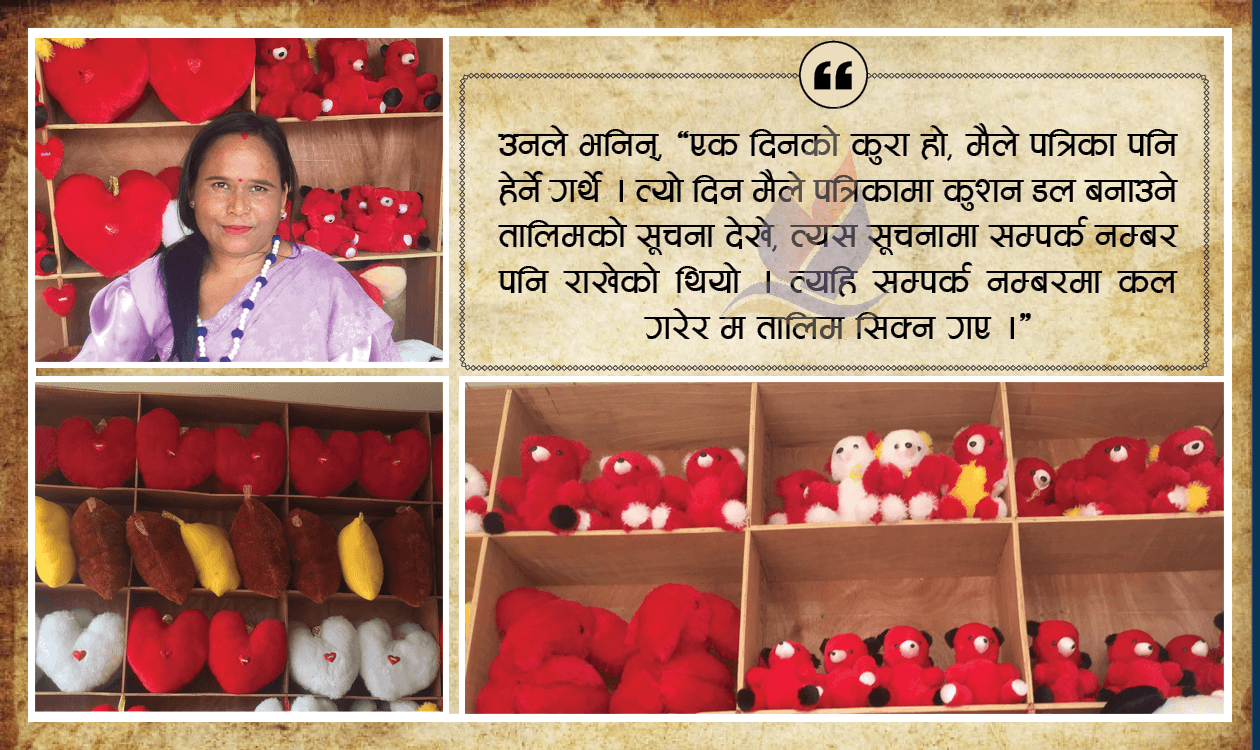 उनको परीक्षा आफुले सोचेको जस्तो नभएको उनले बताईन् । परीक्षा राम्रो नभएपछि उनको मनमा अनेकौं कुरा खेल्न थाले । काठमाडौं जस्तो ठूलो सहरमा जीवनयापनका लागि पक्कै पनि सहज थिएन । उनी पढाईसँगै नयाँ–नयाँ कुरा जान्न पनि चाहन्थिन् । उनले भनिन्, ‘एक दिनको कुरा हो, मैले पत्रिका पनि हेर्ने गर्थे । त्यो दिन मैले पत्रिकामा कुशन डल बनाउने तालिमको सूचना देखँे, त्यस सूचनामा सम्पर्क नम्बर पनि राखेको थियो । त्यहि सम्पर्क नम्बरमा कल गरेर म तालिम सिक्न गए ।’